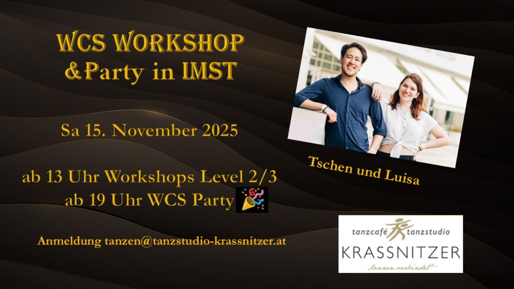 1 Top Trainer Couple, 1 Tanzsaal mit 260m², 2 Levels, 1 gemütliches Tanzcafé / Bar, 6 Workshops á 50 Minuten und 1 Party auf 130m² stehen für ein kleines, aber feines WCS Weekend bei uns im Tanzstudio & Tanzcafé Krassnitzer in Imst.